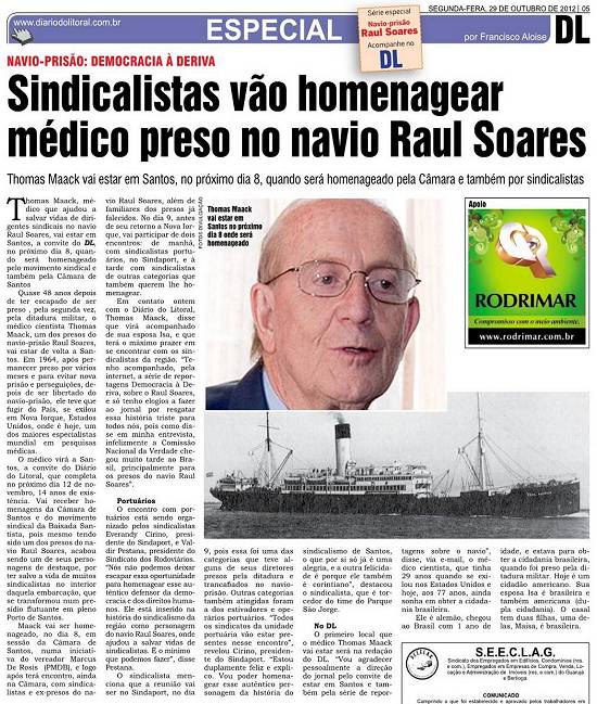 sindicais no navio Raul Soares, vai estar em Santos, a convite do DL, no próximo dia 8, quando será homenageado pelo movimento
