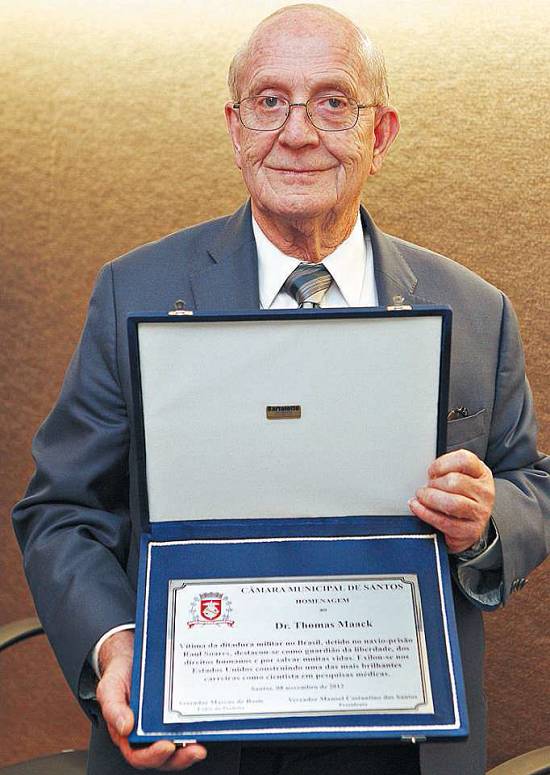 O médico Thomas Maack foi homenageado pela Câmara Municipal de Santos, fato registrado pelo jornal santista A Tribuna, na edição de 9 de novembro de 2012, página A-4: