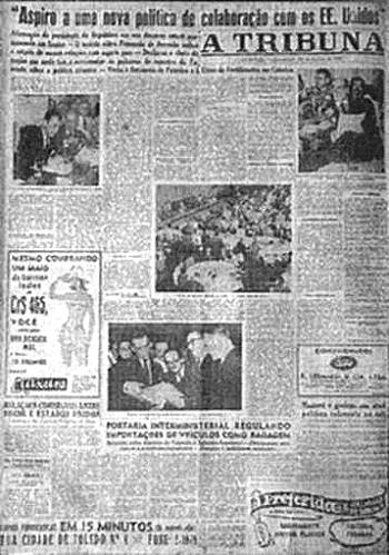 Tribuna no dia seguinte. JK foi recebido na Base Aérea pelo então governador do Estado
