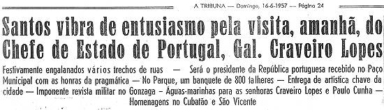 - Imponente revista militar no Gonzaga - Águas-marinhas para as senhoras Craveiro Lopes e Paulo Cunha - Homenagens no Cubatão e São Vicente