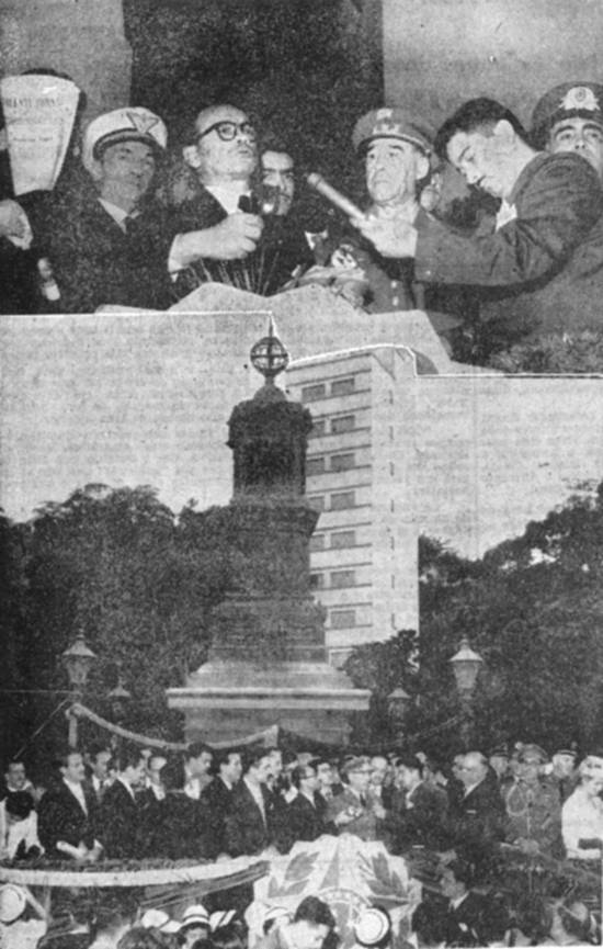 Descendo do carro, em companhia do prefeito de São Vicente, sr. Luiz B. Ferreira, e do general Porfírio da Paz, vice-governador do Estado, o general Craveiro Lopes dirigiu-se para o palanque armado junto ao monumento. À medida que o general caminhava, mais crescia o entusiasmo do povo nas manifestações de apreço e simpatia ao ilustre visitante, que acenava agradecendo a homenagem.