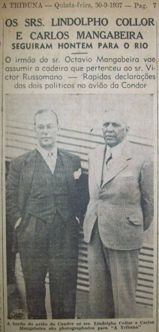 passaram ontem pelo nosso porto, procedentes de Porto Alegre e com destino ao Rio de Janeiro, os srs. Lindolpho Collor e Carlos Mangabeira. Os dois