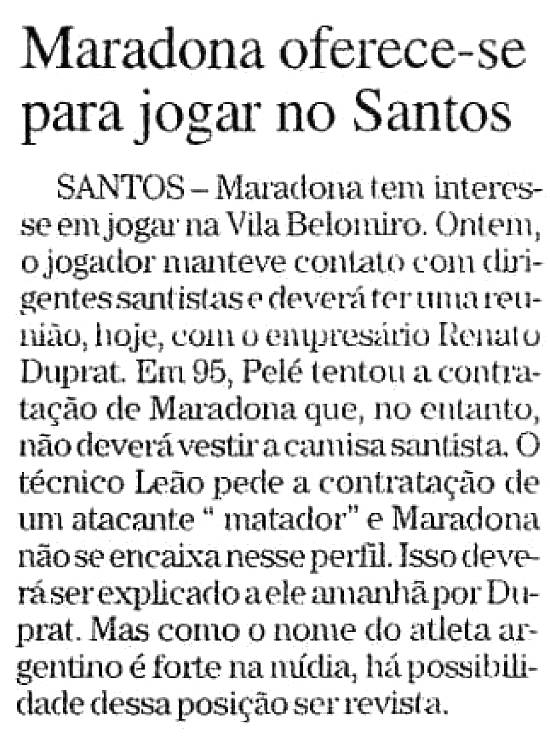 contratação de Maradona que, no entanto, não deverá vestir a camisa santista. O técnico Leão pede a contratação de um atacante "matador" e Maradona