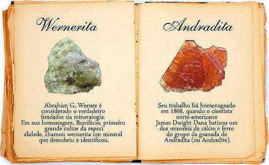 Wernerita - Abraham G. Werner é considerado o verdadeiro fundador da mineralogia. Em sua homenagem, Bonifácio, primeiro grande cultor da especialidade, chamou wernerita um mineral que descobriu e