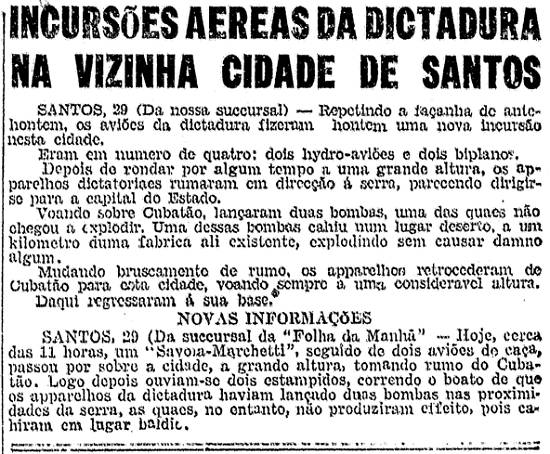 Novas informações - SANTOS, 29 (Da sucursal da Folha da Manhã) - Hoje, cerca das 11 horas, um Savoia-Marchetti, seguido de dois aviões de caça, passou por sobre a cidade, a grande altura, tomando rumo do Cubatão. Logo depois ouviam-se dois estampidos, correndo o boato de que os aparelhos da ditadura haviam lançado duas bombas nas proximidades da serra, as quais, no entanto, não produziram feito, pois caíram em lugar baldio.