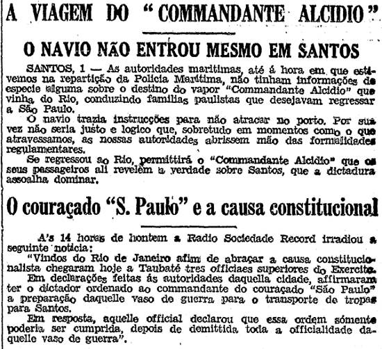 Foi grande o movimento verificado em Santos, de procura de lugares no paquete Commandante Alcidio, que ali deveria aportar, com passageiros paulistas provenientes do Rio. Calcula-se mesmo em mais de setecentos o número de pessoas que se inscreveram na agência do Lloyd Brasileiro, para obter passagem para a capital do país.