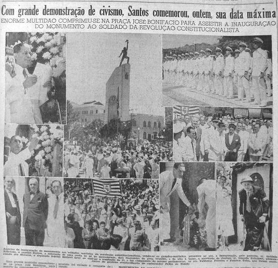Monumento ao soldado constitucionalista - Foi verdadeiramente tocante a inauguração do monumento ao soldado de 1932. Uma grande multidão, não obstante o forte calor que fazia, comprimiu-se na Praça José Bonifácio, a fim de participar do ato cívico em homenagem aos mortos santistas sacrificados pelo bravo movimento constitucionalista bandeirante.
