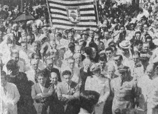 Vultos da revolução - Diversos vultos que se notabilizaram no movimento constitucionalista de 1932 estiveram em Santos no dia 26. Entre eles destacaram-se o deputado Herbert Levy, presidente da Federação dos Voluntários Paulistas; os professores Valdemar Ferreira e Fonseca Teles, secretários de Estado no governo do dr. Pedro de Toledo, durante a revolução. Diretores e representantes do Clube Piratininga e do M.M.D.C também se fizeram representar.