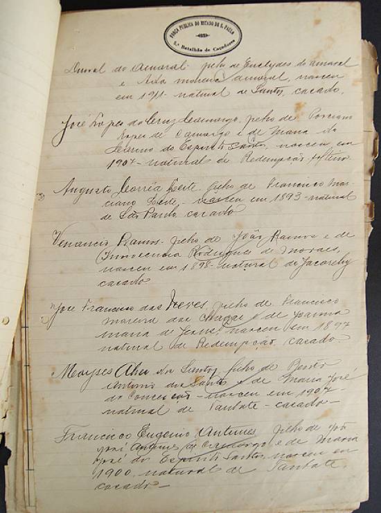 Durval do Amaral, nascido em Santos em 1911, no alto de uma das páginas de um relatório dos mortos em combate do 5º Batalhão de Caçadores da Força Pública do Estado de São Paulo, de julho a outubro de 1932