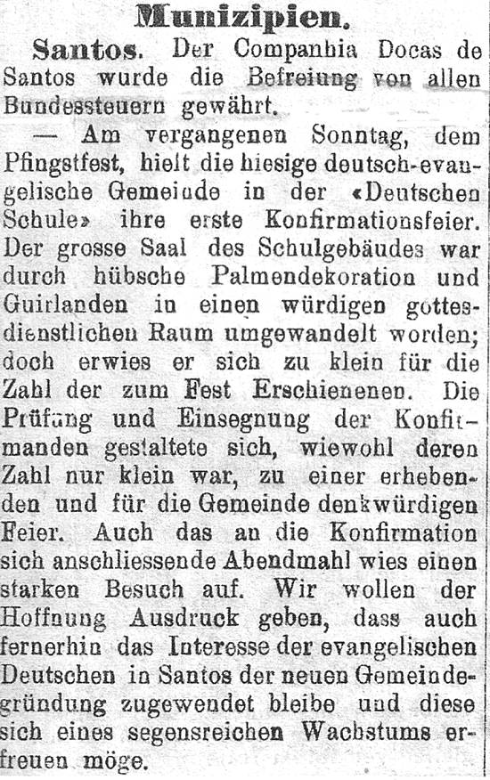 Artigo no Jornal Alemão de 1907 trazendo informações do município de Santos e relatando a realização da primeira confirmação realizada na Comunidade de Santos no domingo de Pentecostes. A confirmação foi realizada na Escola Alemã