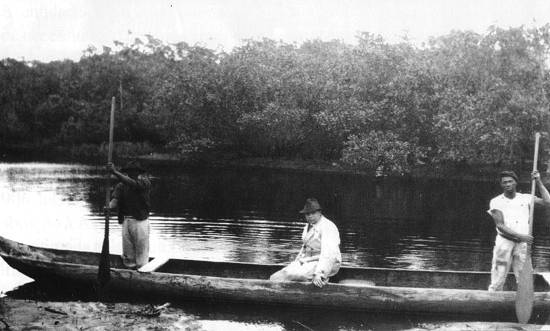 17 de setembro de 1931. Pastor Reichardt, sentado no barco, se prepara para seguir viagem na visita aos colonos, saindo de Cananéia