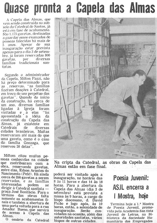 A Capela das Almas, que vem sendo construída no subsolo da Catedral de Santos, já está em fase de acabamento. São 1.175 gavetas, destinadas a guardar ossos