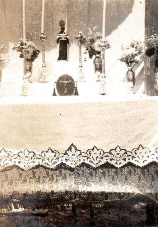 Dentro, havia um pequeno altar, simples com seus degraus, tendo a imagem de São Bendito ao centro, ladeado por São Roque e Santo Onofre - com a cornucópia aos pés, curiosidade das imagens antigas de manufatura popular dos artistas, onde o santo seria o portador da fartura [26] de Deus, sendo também (como até hoje) invocado contra o alcoolismo e como protetor das meretrizes cristãs.