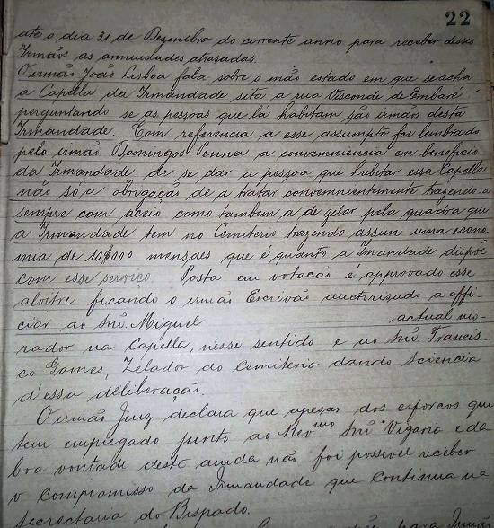 Mais adiante, na página 22, temos esse trecho: "O irmão João Lisboa fala sobre o mau estado em que se acha a capela da Irmandade sita à Rua Visconde do Embaré, perguntando se as pessoas que lá habitam são irmãos desta Irmandade. Com referência a esse assunto, foi lembrada pelo irmão Domingos Pessoa a conveniência em benefício da Irmandade que se dá a pessoa que habitar essa capela, não só a obrigação de a tratar convenientemente, trazendo-a sempre com asseio, como também a de zelar pela quadra que a Irmandade tem no Cemitério, trazendo assim uma economia de 10$000 mensais, que é quanto a irmandade dispõe com esse serviço. Posto em votação e aprovado esse alvitre, ficou o irmão escrivão autorizado a oficiar ao senhor Miguel, atual morador na capela, nesse sentido, e ao senhor Francisco Gomes, zelador do cemitério, dando a ciência dessa deliberação (...)".