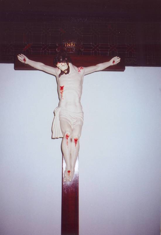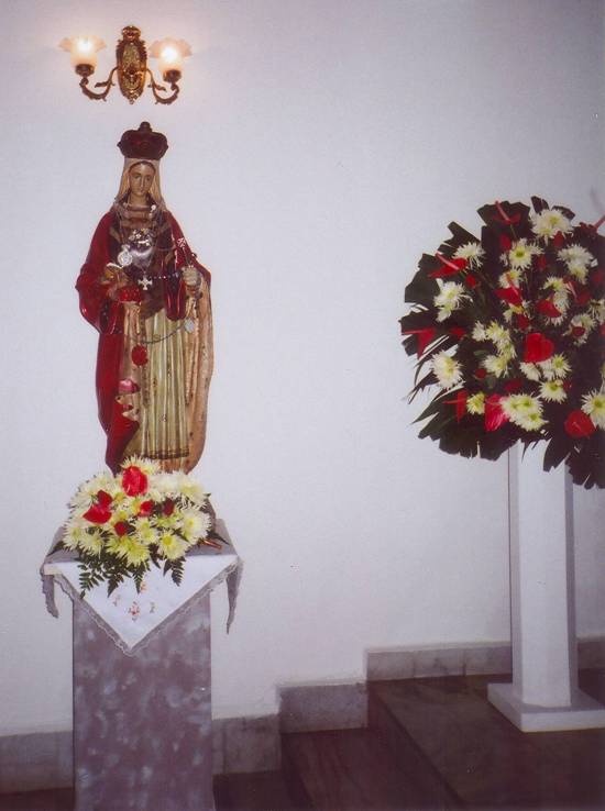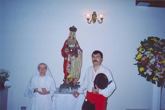 Freira e o professor Carballa, com traje típico, junto à imagem de Santa Isabel, na capela