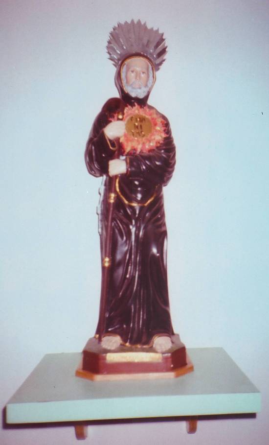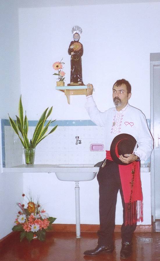 Professor Carballa, em traje típico, junto à imagem de São Francisco de Paula, na Santa Casa