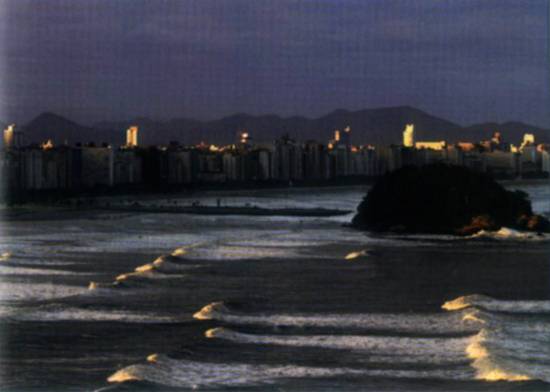 Orla da praia santista, tendo em primeiro plano a ilha Urubuqueçaba, em cartão postal de 2003, vendo-se ainda ao centro da foto a plataforma do emissário submarino santista