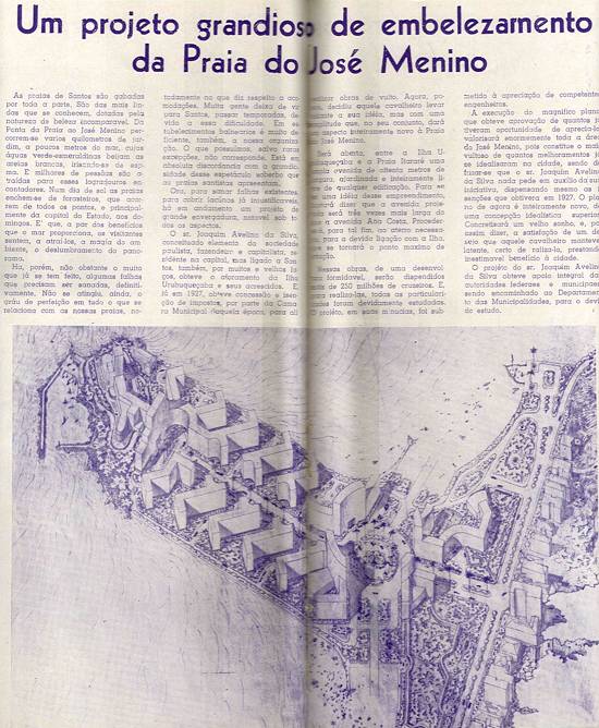 A execução do magnífico plano, que obteve aprovação de quantos já tiveram oportunidade de apreciá-lo, valorizará enormemente toda a área do José Menino, pois constitui o mais vultoso de quantos melhoramentos já se idealizaram na cidade, sendo de frisar-se que o sr. Joaquim Avelino da Silva nada pede em auxílio da sua iniciativa, dispensando mesmo as isenções que obtivera em 1927. O plano de agora é inteiramente novo, de uma concepção idealística superior. Concretizará um velho sonho, e, por assim dizer, a satisfação de um desejo que aquele cavalheiro manteve, latente, certo de realizá-lo, prestando inestimável benefício à cidade.
