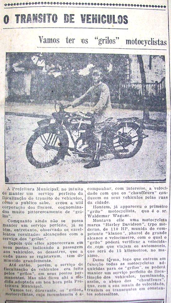 grilos motociclistas, cuja incumbência é acompanhar, com interesse, a velocidade com que os choferes conduzem os seus veículos pelas ruas da