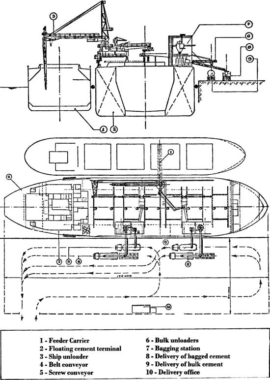 navio-silo para a estocagem a granel. Desenvolve-se, assim, um sistema mais rápido para suprir a demanda de cimento importado, a exemplo do que