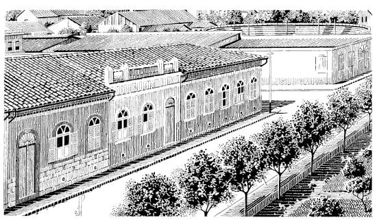 Bico-de-pena do artista Lauro Ribeiro da Silva (Ribs), mostrando o casario da Praça José Bonifácio e, ao fundo, o Coliseu, ainda como ginásio com arquibancadas,