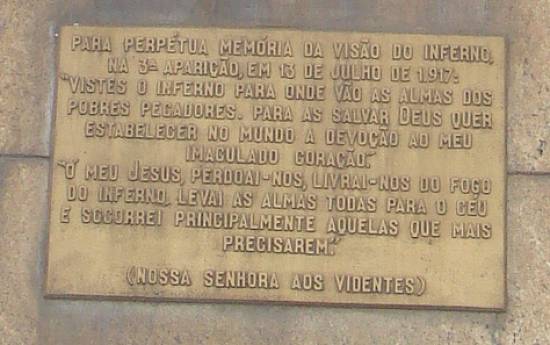Ele se encontra firmado sobre uma rocha de granito, retirada na região de Furna de Tijuca. Também possui aplicações em mármore de ouro velho e dois painéis de bronze, que representam o milagre do sol de 1917 e a visão do inferno.