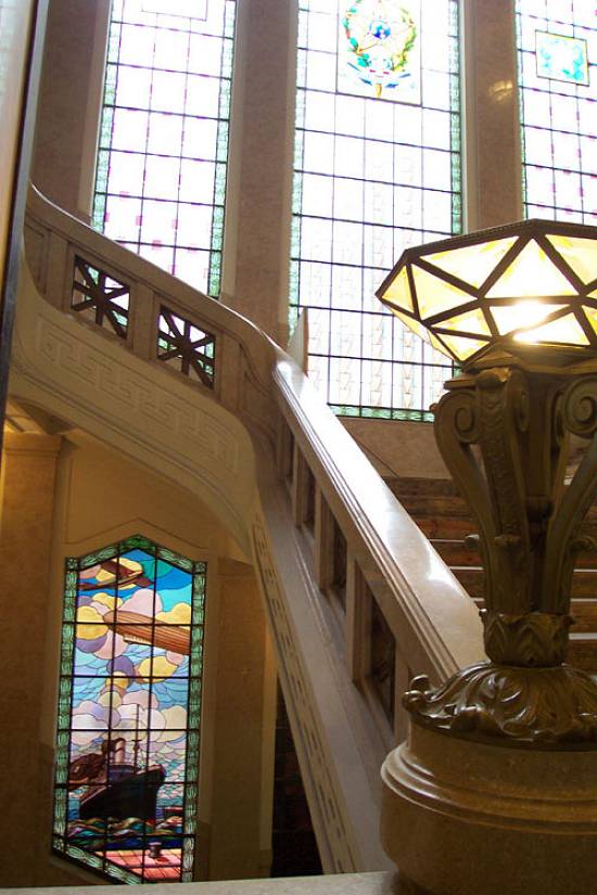 quadrangulares, por vezes ornadas com cimalhas. Também foram recuperados os vitrais de várias janelas e do domo do segundo andar, onde dominam as