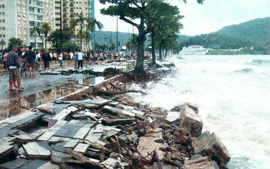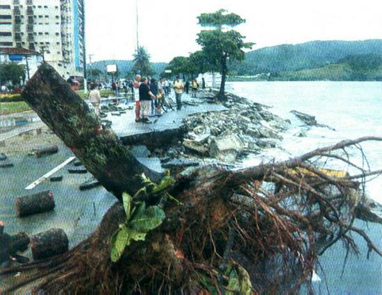 Ondas que chegavam a 3,5 metros, ventos de até 70 km/h e um rastro de destruição marcaram a madrugada de ontem na Ponta da Praia. Um trecho de 30 metros do asfalto cedeu na orla. Apesar de não ter causado vítimas, o fenômeno natural ocorrido em Santos deixou inúmeros prejuízos.