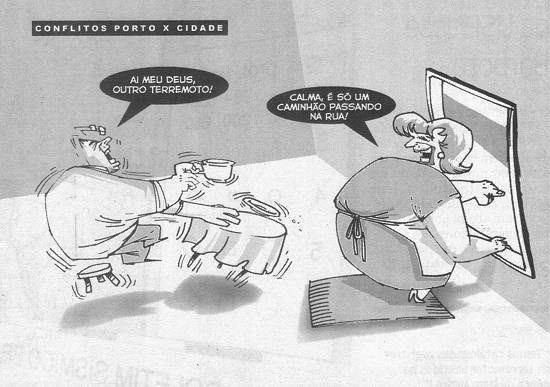 Imagem: charge de Max, na página 2 dessa edição de 24/4/2008. Refere-se aos problemas causados pela expansão do porto avançando sobre uma cidade também em expansão