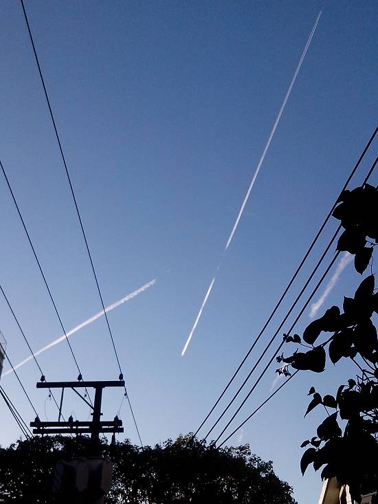 Em dias em que as camadas superiores da atmosfera estão muito frias, a passagem de aviões a jato, com suas emanações de ar quente, podem deixar rastros no céu, formando estas curiosas cenas: