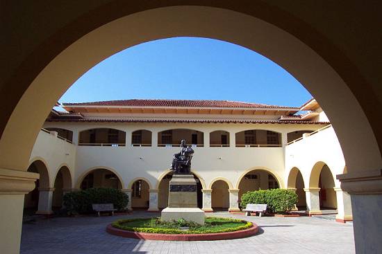Uma estátua de João Octávio lendo um livro está localizada no pátio interno do prédio
