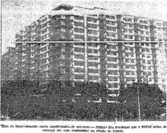 "Vista da impressionante massa arquitetônica de concreto - Edifício São Domingos que a OCIAN acaba de entregar aos seus condôminos na cidade de Santos"