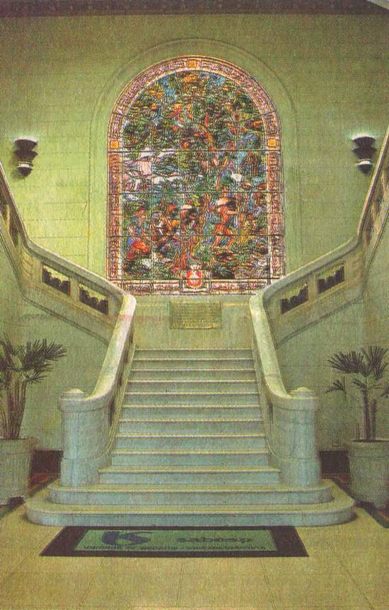 corrimão em mármore, centralizando sobre seu patamar o vitral denominado "Os Bandeirantes", do artista alemão Conrado Sorgenicht.