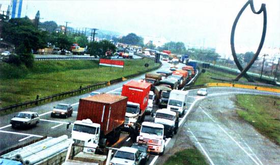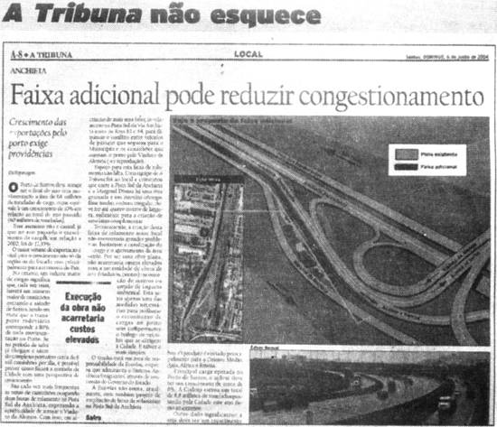 Na edição do dia 6 de junho do ano passado, A Tribuna mostrou uma forma de diminuir os congestionamentos que se formam na Via Anchieta, durante os meses de safra agrícola. Trata-se da construção de mais uma faixa de rolamento (a quarta) na pista Sul da estrada, entre os km 63 e 64, nas proximidades do Viaduto da Alemoa. Com a melhoria, os veículos de passeio e os caminhões teriam mais espaço para se dirigir à Cidade. Nesse local, há áreas livres para o empreendimento, que seria feito no canteiro e sobre o córrego existente entre a pista Sul e a Marginal Direita da Anchieta. Toda a região é de concessão da Ecovias, que não tem projetos para resolver esse problema no local.