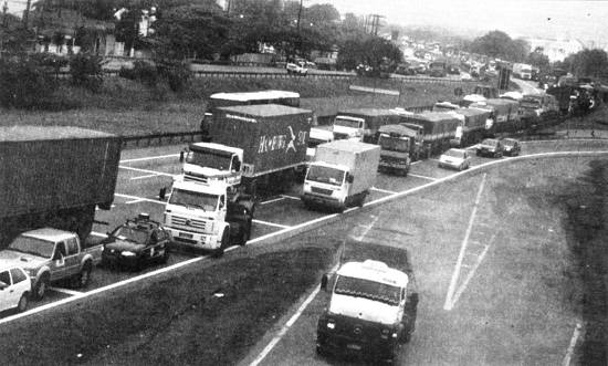 A morosidade do trânsito formou filas na rodovia com até 800 metros de extensão. Conforme a assessoria de imprensa da Ecovias, concessionária do Sistema Anchieta-Imigrantes, o engarrafamento de caminhões se concentrou na faixa da esquerda da Via Anchieta - que dá acesso direto ao Viaduto da Alemoa.