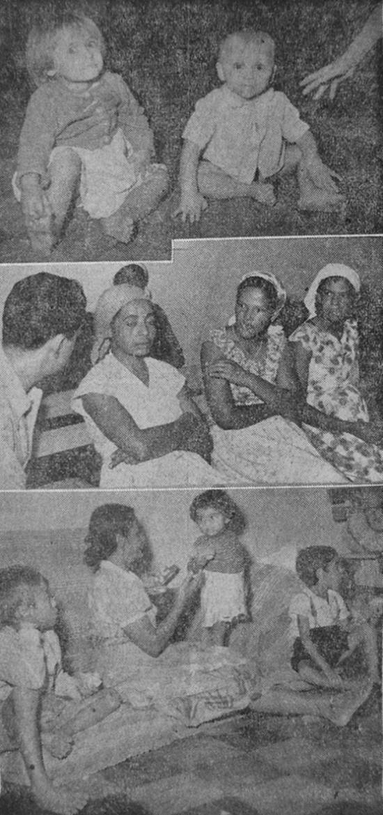 No centro, algumas mulheres narram ao redator detalhes da inundação de suas residências. Na foto de baixo, uma das famílias (mãe e três filhos)