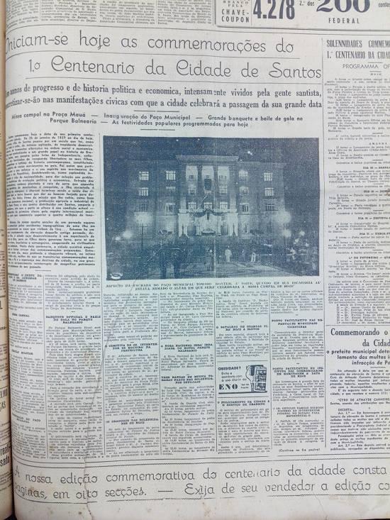 Cem anos de progresso e de história política e econômica, intensamente vividos pela gente santista, concretizar-se-ão nas manifestações cívicas com que a cidade celebrará a