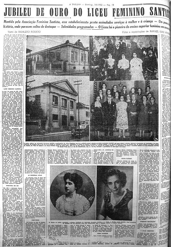 história. Nesta matéria do jornal santista A Tribuna, na página 10 da edição de 3 de agosto de 1952, é registrado o jubileu do Liceu Feminino