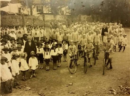 "Esta foto é do pátio do antigo prédio da Escola de Commercio, com os alunos se preparando para o desfile do dia 7 de setembr, em 1928. Minha mãe, Semíramis Pereira Guimarães, está carregando a bandeira, honra destinada à primeira aluna da classe"