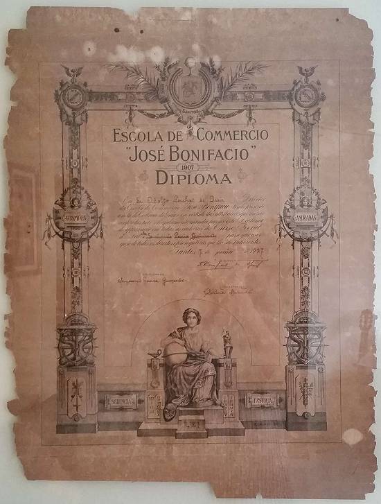 Diploma da Escola de Commercio José Bonifácio, assinado pelo diretor prof. dr. Adolfo Porchat de Assis, em nome de Semíramis Pereira Guimarães, em maio de 1927. Note-se na ilustração de Benedicto Calixto os símbolos do Comércio na presença da Lei, da Ciência e da Justiça, bem como as efígies das ilustres famílias santistas Gusmões e Andradas, bem como a data de criação da escola, 1907