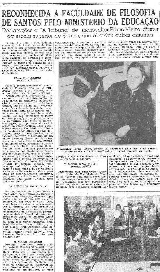 "Santos está muito pobre ainda" - Encerrando suas declarações, ajuntou o diretor da Faculdade de Filosofia: "Santos está muito pobre ainda, no campo do ensino universitário. Contamos com três faculdades superiores, além das duas católicas. Goiânia, com densidade demográfica minúscula em relação a Santos, possui de quatro a seis faculdades superiores. Uberaba, Juiz de Fora e Sorocaba estão bem à frente, sem falarmos de Campinas, que já possui a da Universidade Pontifícia. Santos, para que tenha direito a uma universidade, há que conseguir mais uma faculdade, a de Engenharia, por exemplo, que está nos planos da Sociedade Visconde de São Leopoldo.