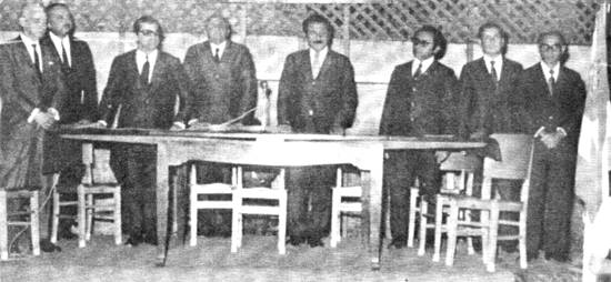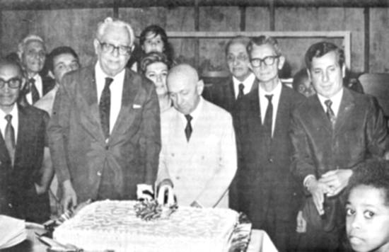 Mesa diretora da solenidade dos 50 anos, incluindo o vereador Fernando Dias Oliva, o cel. Chaves do Amarante (representando o interventor federal em Santos), o deputado Athié Jorge Coury,