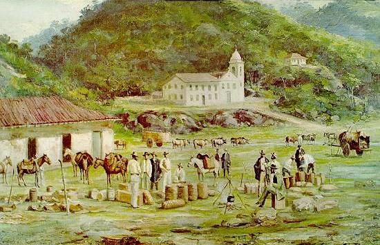pintor-historiador reproduziu imaginosamente o ato oficial da elevação do Porto de Santos ao predicamento de Vila, vê-se um grande prédio de