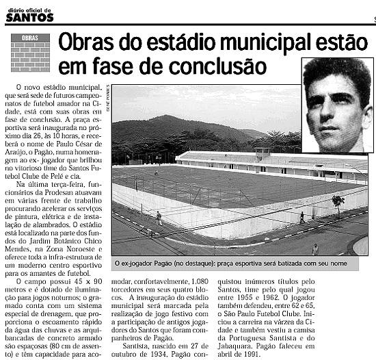 O novo estádio municipal, que será sede de futuros campeonatos de futebol amador na Cidade, está com suas obras em fase de conclusão. A praça esportiva será inaugurada no próximo dia 26, às 10 horas, e receberá o nome de Paulo César de Araújo, o Pagão, numa homenagem ao ex-jogador que brilhou no vitorioso time do Santos Futebol Clube de Pelé e cia.