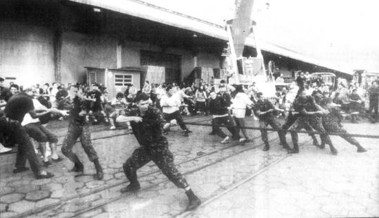O ponto máximo, porém, se registrou à tarde. O cais, nas proximidades do Armazém 31, ganhou um colorido especial. No local, 6.000 pessoas arregaçaram as mangas e atracaram uma draga e um batelão acoplados. O desempenho deu inveja até em prático da barra. Em três minutos, os barcos, que estavam a 30 metros de distância, encostaram no cais em meio a uma enorme festa.