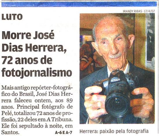 Brasil, José Dias Herrera faleceu ontem, aos 89 anos. Principal fotógrafo de Pelé, totalizou 72 anos de profissão, 22 deles em A Tribuna. Ele