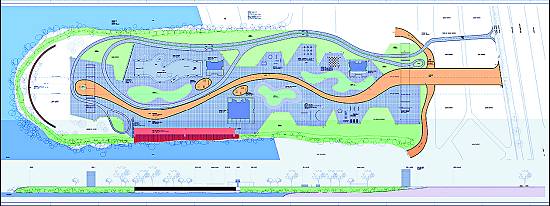 harmonizando o quebra-mar à praia e aos jardins e reservando 50% da plataforma para áreas verdes. Ohtake explica a proposta para o parque em Santos: