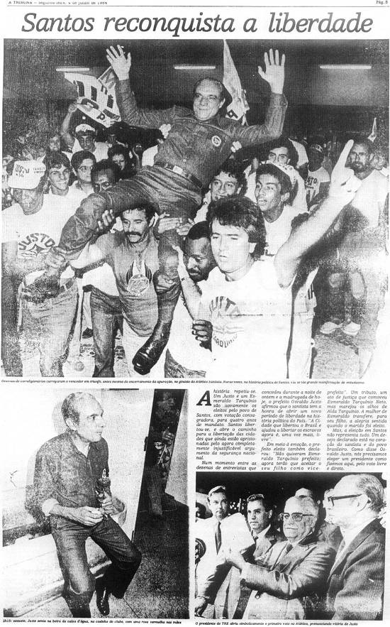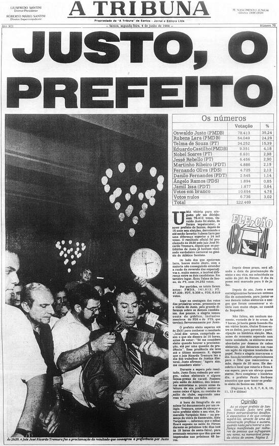 votos, Oswaldo Justo foi eleito, de forma espetacular, o novo prefeito de Santos, depois de 15 anos sem eleições, derrotando o até então favorito