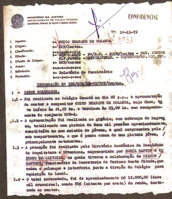 Informe da Polícia Federal de Santos traz relato detalhado de um show de Chico Buarque em