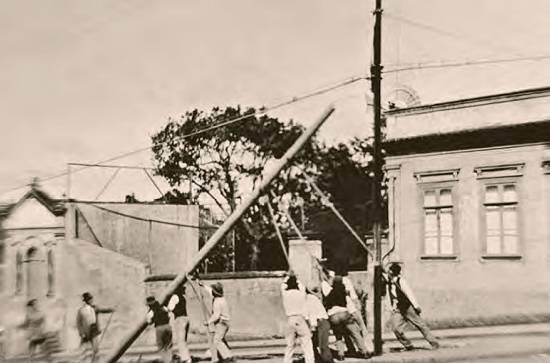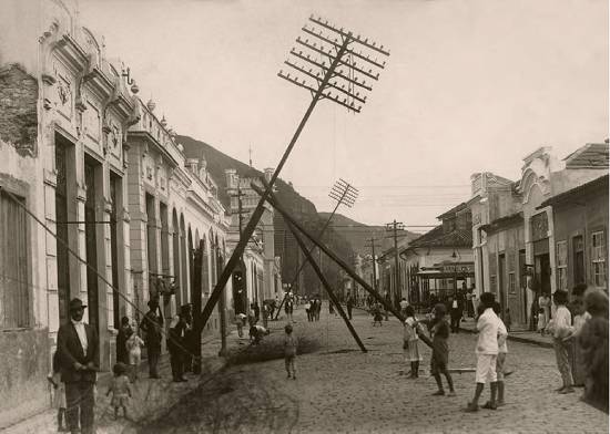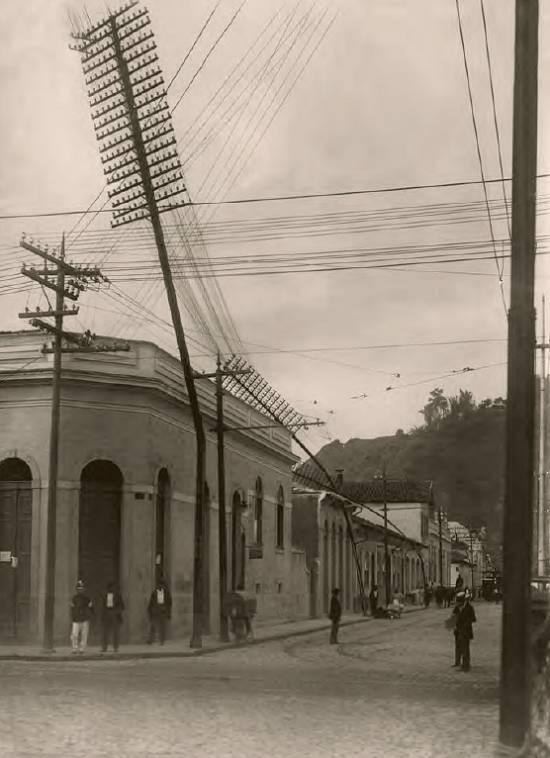 Danos à rede telefônica em Santos causados por um ciclone, em 1/5/1915,